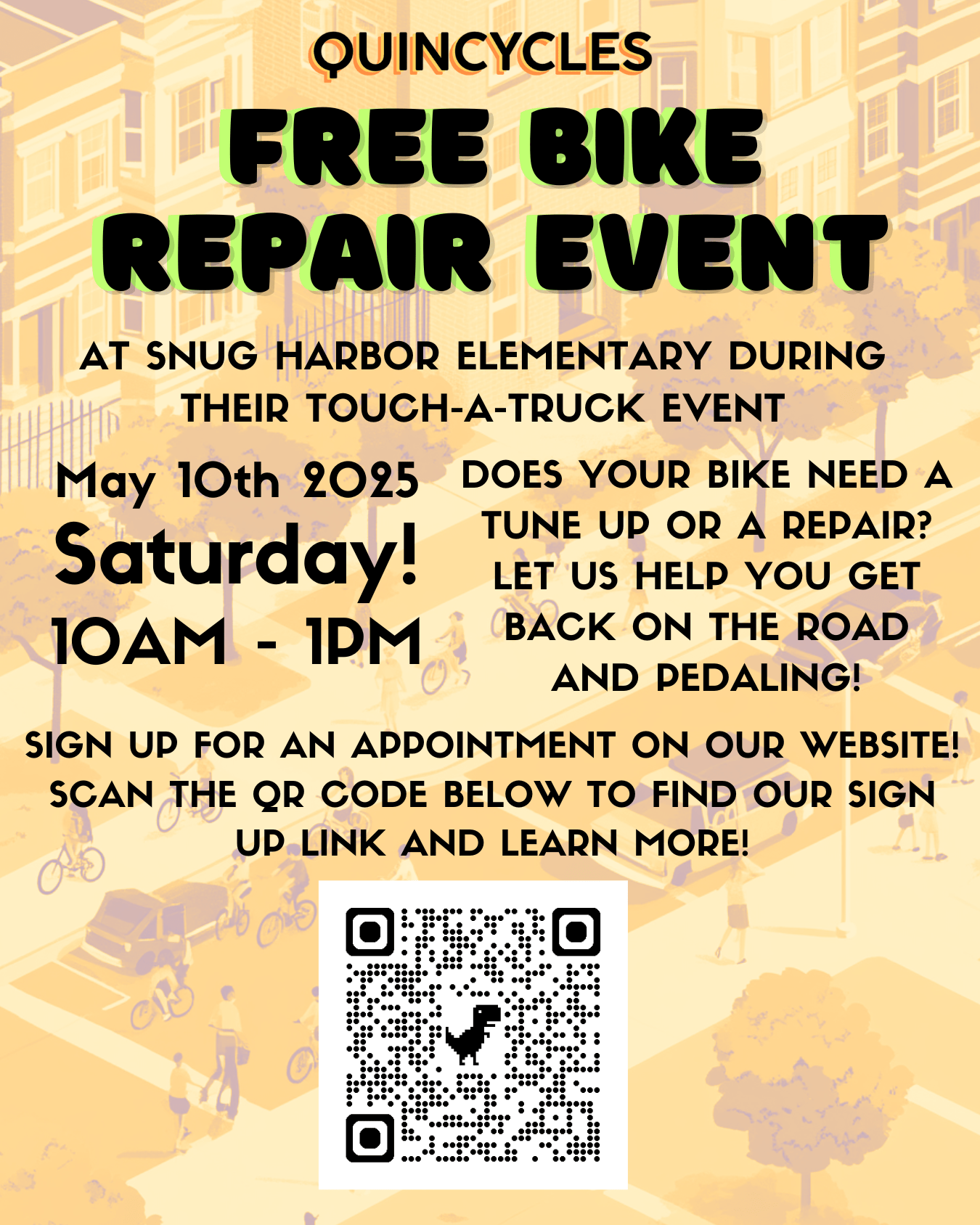 Quincycles is pairing up with Snug Harbor Elementary School to host a free bike repair event during their Touch-a-truck event on May 10th.